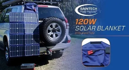 Lightweight and compact! The Baintech 120 Watt Foldable Solar Blanket will produce up to 7amps in optimal conditions. Making it a powerful portable charging source for your 4WD| RV| or Marine batteries. Utilising the highest quality Monocrystalline SUNPOWER solar cell technology| the 120-watt blanket is made for off-grid adventure. Power your fridge| lights| devices| and other campsite accessories.