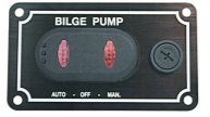 Black textured alloy switch panels for use in controlling bilge pumps. Three-position illuminated waterproof rocker switch for auto| off| and spring return manual setting. Suits both 12 and 24 volt systems. 60mm depth is required behind the panel.