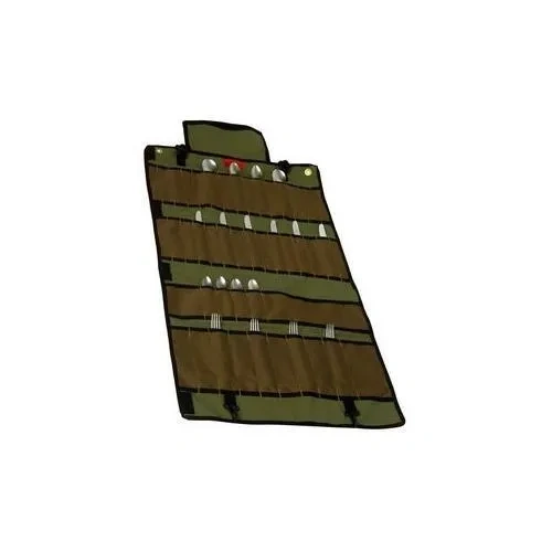 Product Description: Canvas Cutlery Organiser (suit up to 4 place settings). Folds with velcro tabs and strap to hang at camp site. Product code:OLCO4