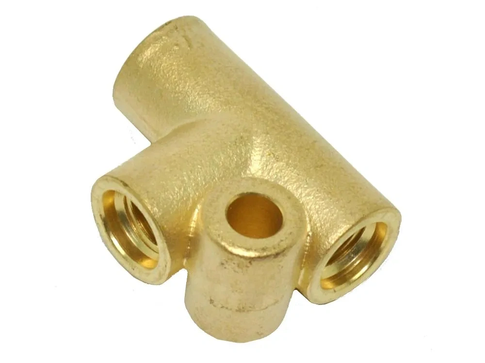 Brake pipe tee piece connector with part number BTB657L. This T connector splits brake pipe hydraulic flow at opposing 90 degree angles.