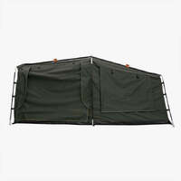 One of your favourite Darche products has become much greener with the introduction of the latest eco-friendly recycled materials. The ecoWGAFâ material cleans up and delivers high performance in tear strength| abrasion resistance| colour fastness and water repellency. If you're after the ultimate freestanding tourer| the Dirty Dee swag is made for you. With its roomy design| this Darche swag is both functional and comfortable - a true home away from home. It's no surprise this swag is a favourite among Darche campers. Set up is a breeze with the trigger lock ridge poles and Darche's signature heavy duty composite poles. The Dirty Dee swag is free standing| its huge entry doors on both sides ensure that you can enjoy the incredible views. The super-fine mesh windows offer great ventilation| keeping you cool while ensuring you're well protected from the mozzies. The Eco Dirty Dee swag is made from recycled 280gsm ripstop polyester premium with an impressive 5000mm waterhead rating. Thereâ also internal seam sealing and a reinforced| heavy-duty 600gsm PVC bucket floor to keep you dry in those rainy conditions. It comes with a premium quality| high-density 70mm foam mattress with a removable cover. The swag bag is perfect for storage and protection while you're on the go - just throw it in the back of the car or on the roof rack and get on the road. FEATURES & SPECIFICATIONS & DIMENSIONS Recycled 280gsm ripstop polyester in Darcheâ original heritage green colour Exceptional ventilation with two large doors and cross flow ventilation from six points High-density 70mm foam mattress with removable cover Protection from the mozzies and other bugs with super- fine insect mesh on all doors and windows All-season protection including internal seam sealing and full length welded PVC bucket floor Heavy-duty construction including no. 10 easy action zips on all windows and doors Two internal storage pockets to stash your gear Includes pegs and guy ropes Includes swag bag with side grab handles| tensioning straps and stainless steel D-rings