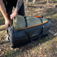 The Mammoth Wheeled Bag is an oversized bag| perfect for hauling bedding or equipment from car to campsite. With a tough rigid EVA base and large heavy duty wheels| itâ never been easier to transport all your gear. With a large 150 Litre capacity| this bag is large enough for bedding or camping gear| including swags up to 900mm wide. Inside the bag are three internal straps to secure equipment and four internal mesh zippered pockets for stashing smaller items. At the top end of the bag is a towing handle and at the base end| a grab handle. The mid-section of the bag incorporates two carry handles and a grab strap. Featuring weather proof materials and zippers the Mammoth Wheeled Bag is great for vehicle roof transport to and from your destination. FEATURES SPECIFICATIONS • Oversized wheeled bag with tough EVA base • Large 150 Litre capacity • Fits bedding| camping gear and swags up to 900mm wide • Weatherproof PVC material • Weatherproof zippers on main compartment & side pocket • Heavy duty ø10mm wheels for transporting to and from your destination • Four internal orange mesh pockets with zipper closure • Three internal straps to secure equipment & gear • Top end towing strap and base end grab handle • Mid-section carry handles & grab strap SPECS Materials 500D PVC (Shell) / 420D Polyester PU (lining) / Nylon (mesh) Wheels Heavy Duty ø10mm wheels (PP + PVC) Maximum Volume 150 L Fits Swags up to 900mm width External Dimensions 930L x 400D x 400H mm Weight 3.8 kg Warranty 2 YEARS