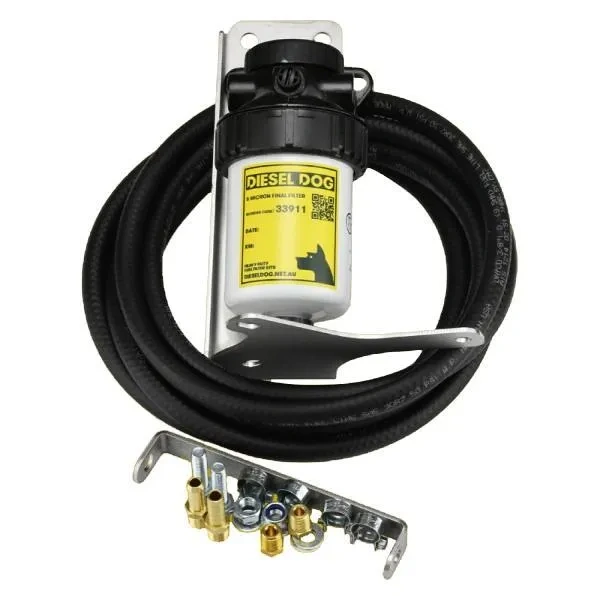 Diesel Dog Final Fuel Filters As the old saying goes| prevention is better than cure. The same is true for your diesel engines. Prevention| in this case| comes in the form of diesel fuel filter kits. A high-quality final fuel filter is vital for protecting advanced| high-pressure systems and allowing your engine to run at peak performance. Modern diesel engines are fitted with advanced high-pressure| electronically controlled injection systems. These engines are designed to provide significant improvements in combustion efficiency| power and economy| running at extremely high pressure and very close tolerances. However| advancement comes with a price: modern systems are susceptible to damage| as a result of poor-quality fuel and more commonly| contaminated fuel. Whether it be water or particles that pass through| repairing damage due to contamination can be truly expensive! One way to give yourself peace of mind is to add heavy-duty protection to your common rail diesel. Diesel Dog has the answer. This 4WD Filter kit comes complete with: 2 or 5 micron fuel filter unit Vehicle-specific mounting bracket All fuel hoses| clamps| nuts and bolts Why do I need an additional filter? Current generation diesel engines are fitted with common rail fuel injection systems. These engines offer huge improvements in power and economy compared to diesels of 20 years ago. To achieve this performance| common rail injection systems run at extremely high pressure and very close tolerances. More than ever before| extra protection is critical to avoid costly injector and fuel pump damage & downtime. Standard factory filters simply do not offer the protection and water stripping ability that is needed to ensure the fuel quality needed. Does this filter go before or after the factory filter? The Diesel Dog kit is set up after the factory filter as a final filter. This is so everything missed by the factory filter is caught before it can do any damage. Can I fit this additional filter myself? Yes! The Diesel Dog kit comes complete with filter unit| vehicle specific stainless steel mounting bracket and all fuel hose| clamps and hardware required to install. Detailed fitting instructions with colour pictures make it very straight forward to fit. How often do I change the final filter? Simply change the final filter when the factory filter is changed. Do these fit with dual battery setups? Yes. On most applications it has been designed to fit with duel batteries. If in doubt| please check installation pictures or contact us for any assistance! Will this restrict the fuel flow? No. The filter unit is designed to support sufficient fuel flow for engines rated up to 260 kilowatt. Will it affect fuel consumption or performance? No. Installed correctly an additional filter will not alter fuel consumption or performance.