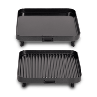 This stylish| lightweight gas barbecue is the ultimate table top companion| with two independent burners. Well equipped for versatile cooking| the appliance comes standard with two pot stands| an additional coffee stand as well as a ceramic coated grill plate and ribbed plate. The set also includes a practical handle for removing the grill plates when hot. Two windshields to be fitted on the sides of the stove to protect the flame. There’s also a gas button protection to prevent unintentional opening of the gas supply| which is especially handy with small children around.