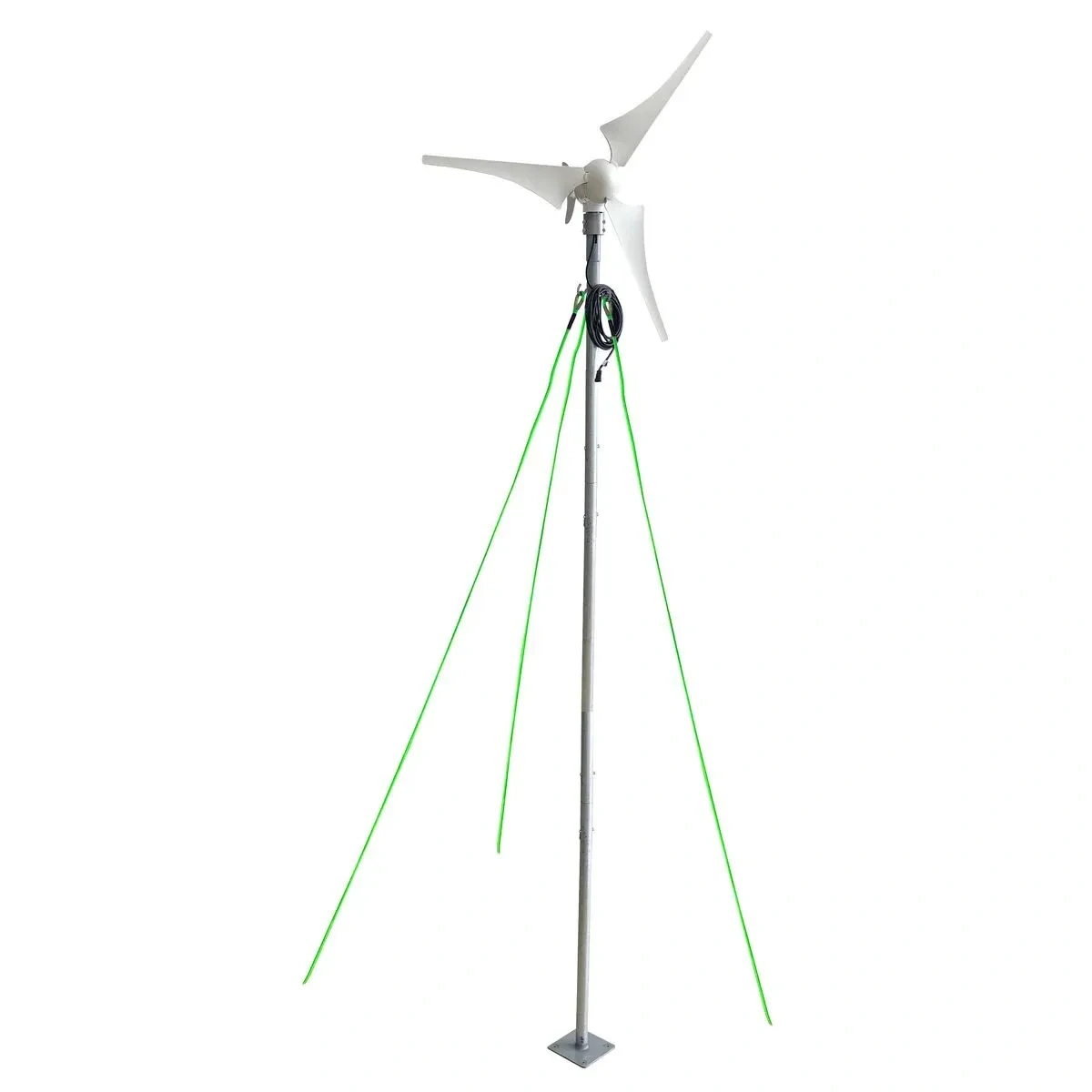 The three blades which measure one meter in diameter| are made from nylon fibre which makes it extremely strong| being able to withstand up to 45 meters per second of devastating winds. It is extremely portable| weighing only 6kg it is held down by guy wires and supported by a one-metre-high galvanised steel pole. You won’t need to reposition the wind generator too much| as it adjusts its position based on the incoming winds. It comes complete with a regulator and can be connected directly to an auxiliary battery with the red and black wires provided.