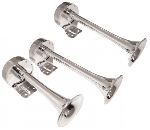 Budget-priced| compact marine trumpet horns made from chromed plastic and stainless steel with all stainless steel fastenings.