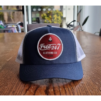 Classic Trucker Cap in a 5 Panel make.  Navy with White sides/back.  Detailed with embroidered front patch and rear woven label