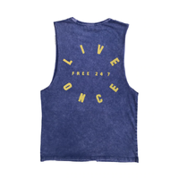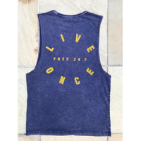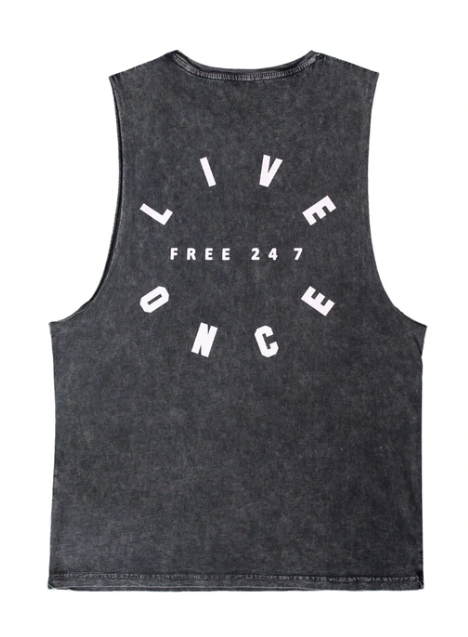 Detailed with a simple LIVE ONCE back print and small colour matched front pocket| this deluxe Tank is finished in a classic Stonewash - perfect for your "LIVE ONCE" active lifestyle