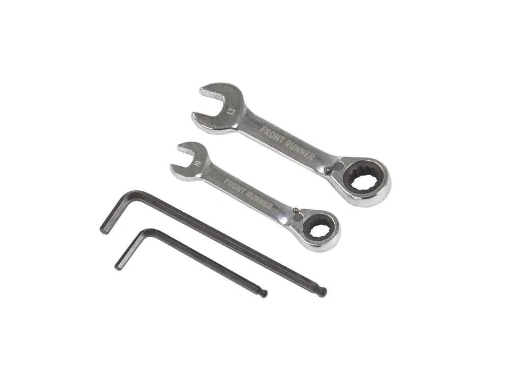 The Front Runner 4 piece tool kit is all you need for moving around rack accessories| reconfiguring Slimline II Roof Rack slats| and general Front Runner accessory adjustments. This high quality kit is compact and can be stored within easy reach.Includes the following: 1 x 5mm Ball type Hex Key 1 x 4mm Ball type Hex Key 1 x 10mm Ratchet Wrench Tool 1 x 13mm Ratchet Wrench Tool