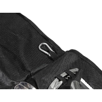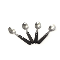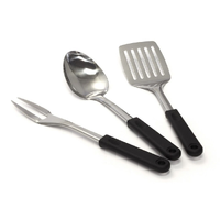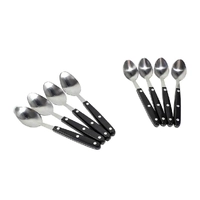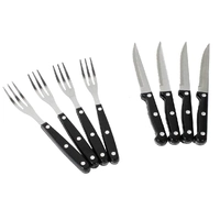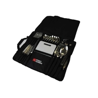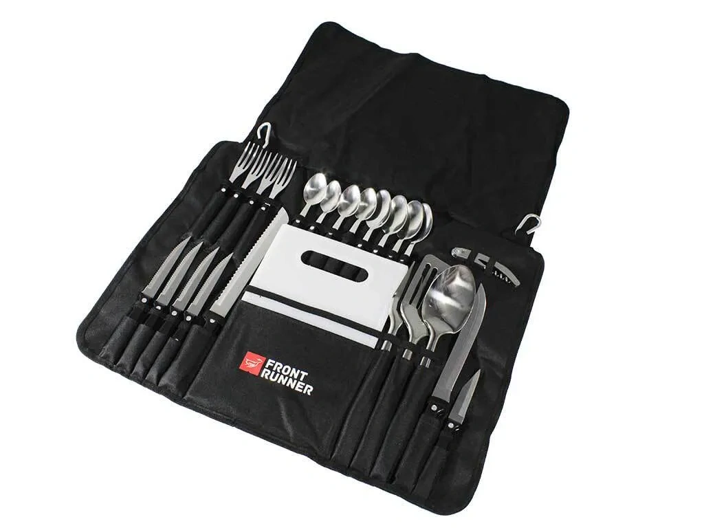 These are not your typical cheap| and easy to break| ''throw away'' camp utensils.The composite handles offer a comfortable and ''weighty'' grip.Triple riveted knife handles with double riveted fork and spoon handles.Professional forged knife blades with black comfort grip poly handles.The steak knives feature high quality| micro-serrated edges. CONTAINS:4 x serrated knives4 x steak forks4 x dessert spoons4 x tea spoons1 x chopping board1 x paring knife1 x bread knife1 x carving knife1 x serving spoon1 x spatula1 x tongs1 x Bottle opener and corkscrew The entire kit fits in a custom tool-style roll with flap| adjustable straps and buckles| and carrying handles. Also features loops with carabiners so the opened roll and utensils can be hung for quick and easy access.