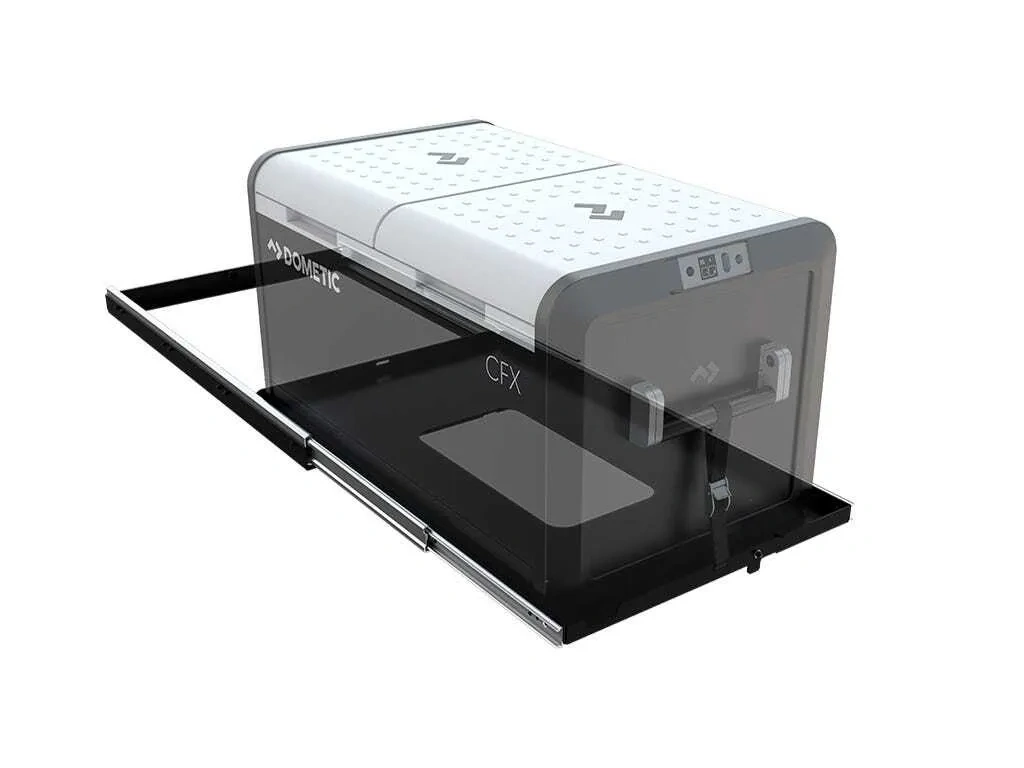 This slide system makes accessing your fridge or other heavy gear quick and simple while using minimal space. Mountable to any flat surface| including Front Runner drawer systems and pick-up truck beds. Mounting holes are predrilled. High strength bearing drawer slides allows the tray to extend nearly 100% from the anchored base. Unique design keeps the slide rattle free when closed. A swivel latch securely locks the drawer in the closed position. Finished in the same durable weather resistant black powder coating as the Front Runner Slimline II Roof Rack. Can have many other uses| like carrying tools| boxes| or other adventure gear. Mounting hardware included for wood and metal surfaces. Note: Fridges or other storage containers are not included when purchasing this Cargo Slide and are sold separately.