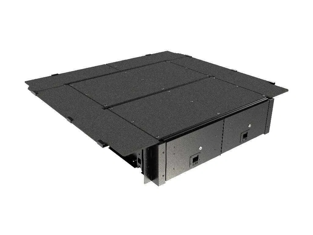 This drawer kit has 2 lockable drawers| 2 keys per lock| 3 tie down rails| 6 tie down rings| deck completion set| face completion set| brackets| all necessary installation hardware| and detailed fitment instructions. 113kg / 250 lb per drawer load carrying capacity. High-strength bearing slides allows each drawer to extend nearly 100% from the anchored base. This drawer kit can be easily installed in minutes by attaching the supplied carabiners and turnbuckles to the vehicle’s existing mounting points and the drawer mounting brackets. Removing the drawers is just as easy. Provide peace of mind and security by locking away important travel items such as computers| smart phones and camera gear. The flat deck incorporates three cargo attachment channels and 6 SSCA047. Customize your own storage configurations. Stack and secure luggage| SBOX031| SBOX001| aluminum boxes and other storage containers to the top deck using STRA034 or other straps. The deck above the drawers can also be used to mount Front Runner Cargo / Fridge Slides. The left side Faceplate has 4 pre-cut knock-outs for adding electrical panel socket inserts. The right side faceplate has 2 pre-cut knock-outs for water fittings such as the WTAN037 (sold separately). The side decks are easily removable creating storage space between the drawers and vehicle for a variety of items such as tools| jumper cables| tow ropes| diving snorkels| masks| fins| kindling| barbeque skewers| etc. To create compartments within the drawers| add the optional steel SSCA050. Drawer Dividers help organize and stop excessive movement of gear and supplies. Sold in pairs| these drawers can accommodate up to 4 dividers per drawer. To create a removable box option| use SBOX001 or SBOX027 inside the drawers. The SBOX001 or SBOX027 can be used to further organize and easily move gear in and out of a vehicle. The deck is covered with a durable| UV resistant nylon pile black carpet. The nylon carpet surface creates resiliency for securing cargo while insulating against noise and vibration. Finished with the same durable black powder coating as Front Runner Roof Racks and other Front Runner products. This storage system is designed for interior use with a canopy| camper shell| or other style bed / load bed cover. All Front Runner Storage Systems are backed by a 2 year warranty.*Please Note: Cub Packs and Flatpack Storage Boxes are not included when purchasing this Drawer System and are sold separately.Note: The Deck Completion Set for this drawer kit requires modification when installed with an existing plastic load liner.
