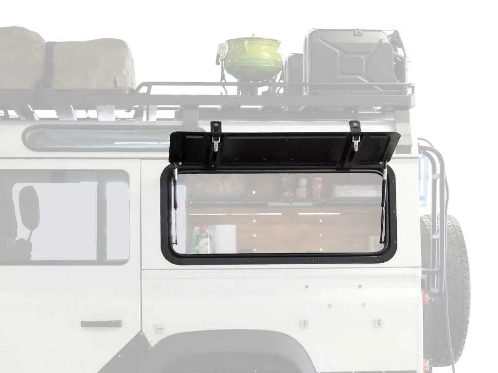 The Front Runner Gullwing window replaces the rear window of a Land Rover Defender allowing easy access to the cargo bay via the side of the vehicle. While built for off-road durability and ease of use| the Front Runner Aluminum Gullwing Window looks smart and was designed to blend seamlessly with the exterior stylings of the vehicle. Fits in minutes| no modifications required. Sealed with the same durable| weather resistant powder coating as the Front Runner Slimline II Roof Rack. Includes 2 locking latches. The Land Rover Defender can be brought back to stock within minutes by removing and replacing with standard window. Note: The glass and aluminium panels for the Land Rover Defender are not interchangeable.