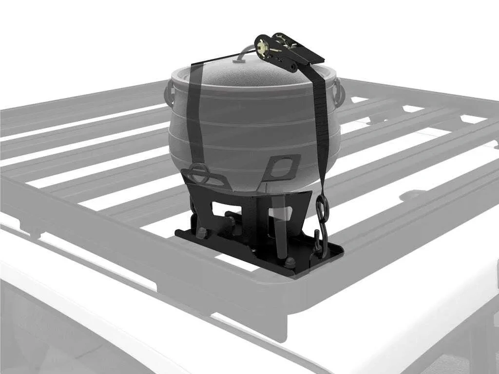 Create deliciously hearty meals out in the wilderness| fit for the avid explorer and overlanding veterans alike.​ The Front Runner Potjie Pot/Dutch Oven Carrier is a safe and durable means of transporting your potjie pot/dutch oven where ever your travels may take you.The potjie pot/dutch oven is placed centrally into the bracket with the three legs fitting into the holes in the three protrusions extending from the centre of the bracket. The supplied ratchet strap threads through the lid of the pot and fixes to pre-drilled points on the bracket. Made of corrosion resistant steel and black powder-coated with an industry preferred| outdoor rated coating.