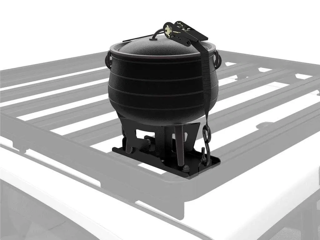 Theres no better place to keep potentially hot| grimy| dirty| and cumbersome camp kitchen supplies than up and out of the way| outside the vehicle.The Front Runner Potjie Pot Carrier offers a sensible way to travel with a potjie pot.The potjie pot is secured in the bracket by the three legs. The supplied ratchet strap threads through the lid of the pot and fixes points on the bracket.The #3 cast iron pot holds 7.8L / 2.1 Gallons. The round shape and cast iron allows the heat to flow evenly around the sides and maintain liquids at the lowest point to keep them from burning. The lid has a deep lip for holding hot coals.The high strength steel carrier is finished with the same durable| weather resistant powder coating as the Front Runner Slimline II Rack.Like all Front Runner rack accessories| the installation is simple. Just slide the bolts into the t-slots of any Front Runner Rack Tray| set down the carrier| then add nuts and tighten.