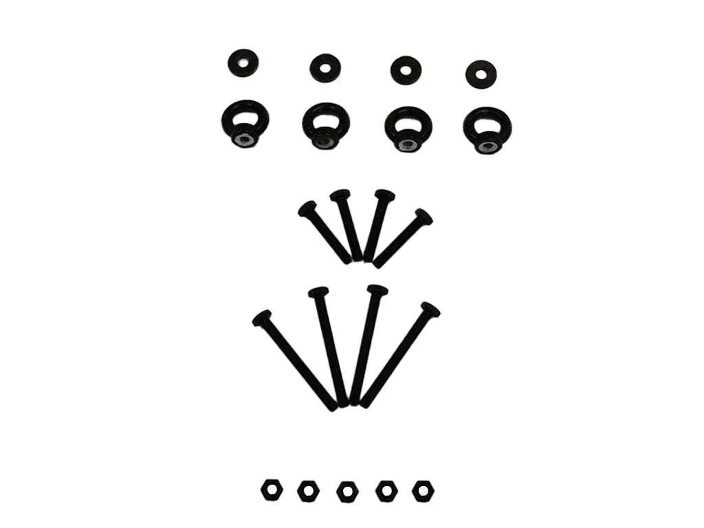 Consists of:4 x M10 x 100 Hex Bolt4 x M10 x 60 Hex Bolt4 x M10 x 30 x 3 SS Flat Washer4 x M10 Eye Nut4 x M10 Nylock Nut Materials used:Black powder-coated high strength steel Weight:0.78kg (1.7lbs)