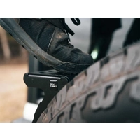 Convenient means of reaching your roof rack. Attaches to rear mounted spare wheel using heavy duty black ratchet strap provided. Allows effortless access to Roof Racks. Black powder coated high strength steel frame with non-slip tread plates. Fits wheel sizes from 24'' to 35''. No drilling| no tools -- just wrap| ratchet tight| and step up. Can be used to secure the VACC023to your vehicles spare wheel.