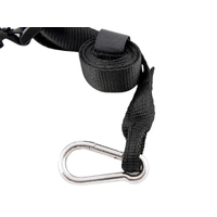 Sold in PAIRSAdjustable from 22'' (560mm) to 63'' (1524mm) from the hook end of the carabiners. With up to an additional 8” of length when stretched. Working Load Rating 220 lbs (100kg) Materials used:Polyester webbingLatex Bungee7mm Stainless Steel Carabiner Weight:230g (8.1oz) each460g (16.2oz) per pair