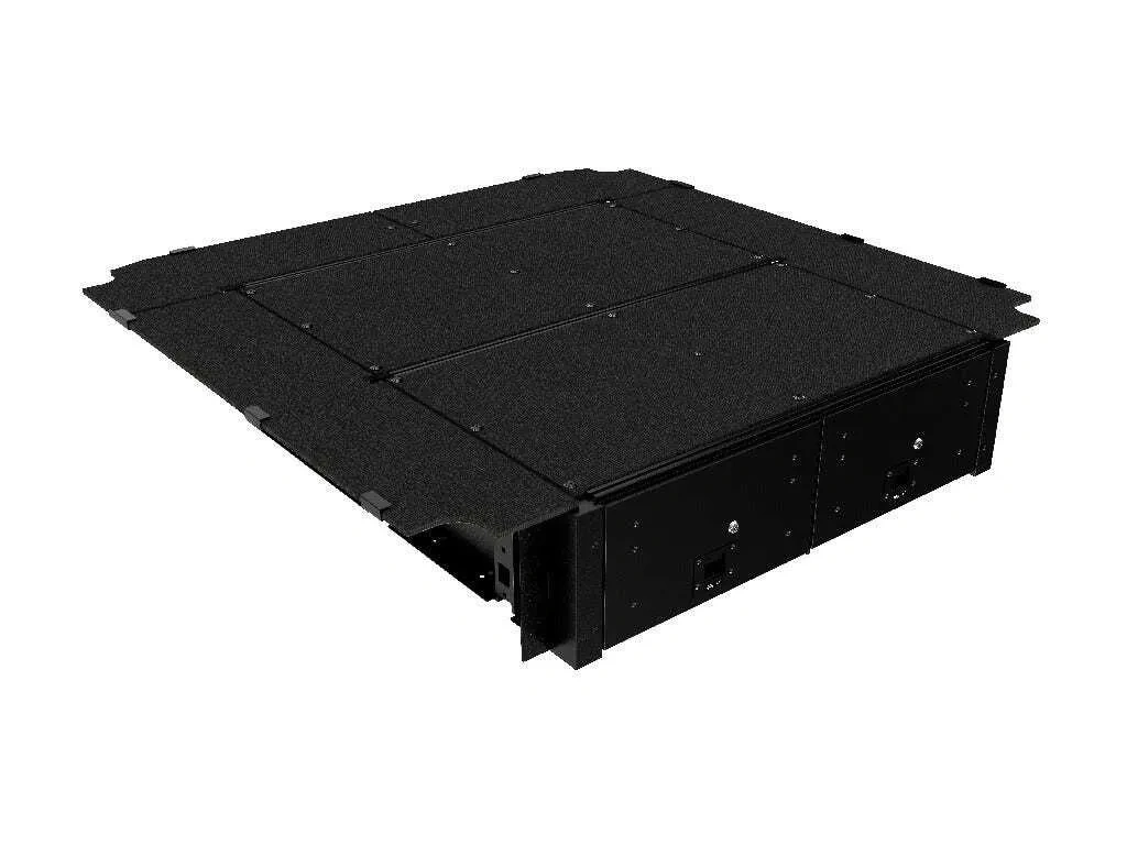 This drawer kit has 2 lockable drawers| 2 keys per lock| 3 tie down rails| 6 tie down rings| deck completion set| face completion set| brackets| all necessary installation hardware| and detailed fitment instructions. 113kg / 250 lb per drawer load carrying capacity. High-strength bearing slides allows each drawer to extend nearly 100% from the anchored base. This drawer kit can be easily installed in minutes by attaching the supplied carabiners and turnbuckles to the vehicle’s existing mounting points and the drawer mounting brackets. Removing the drawers is just as easy. Provide peace of mind and security by locking away important travel items such as computers| smart phones and camera gear. The flat deck incorporates three cargo attachment channels and 6 SSCA047. Customize your own storage configurations. Stack and secure luggage| SBOX031| SBOX001| aluminum boxes and other storage containers to the top deck using STRA034 or other straps. The deck above the drawers can also be used to mount Front Runner Cargo / Fridge Slides. The left side Faceplate has 4 pre-cut knock-outs for adding electrical panel socket inserts. The right side faceplate has 2 pre-cut knock-outs for water fittings such as the WTAN037 (sold separately). The side decks are easily removable creating storage space between the drawers and vehicle for a variety of items such as tools| jumper cables| tow ropes| diving snorkels| masks| fins| kindling| barbeque skewers| etc. To create compartments within the drawers| add the optional steel SSCA050. Drawer Dividers help organize and stop excessive movement of gear and supplies. Sold in pairs| these drawers can accommodate up to 4 dividers per drawer. To create a removable box option| use SBOX001 or SBOX027 inside the drawers. The SBOX001 or SBOX027 can be used to further organize and easily move gear in and out of a vehicle. The deck is covered with a durable| UV resistant nylon pile black carpet. The nylon carpet surface creates resiliency for securing cargo while insulating against noise and vibration. Finished with the same durable black powder coating as Front Runner Roof Racks and other Front Runner products. This storage system is designed for interior use with a canopy| camper shell| or other style bed / load bed cover. All Front Runner Storage Systems are backed by a 2 year warranty.*Please Note: Cub Packs and Flatpack Storage Boxes are not included when purchasing this Drawer System and are sold separately.Note: The Deck Completion Set for this drawer kit requires modification when installed with an existing plastic load liner.