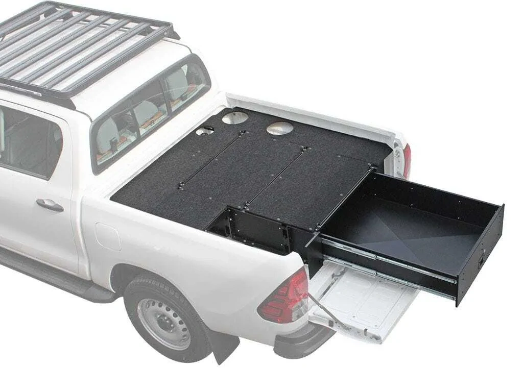 This drawer kit has 1 lockable drawer| 2 keys per lock| 3 tie down rails| 6 tie down rings| deck completion set| face completion set| brackets| all necessary installation hardware| and detailed fitment instructions. 180kg / 397lb drawer load carrying capacity. Hold open feature:  drawer “locks” open while parked on uneven surfaces. High-strength bearing slides allow the drawer to extend nearly 100% from the anchored base. Provide peace of mind and security by locking away important travel items such as computers| smart phones and camera gear. The flat deck incorporates three cargo attachment channels and 6 SSCA047. Customize your own storage configurations. Stack and secure luggage| SBOX031| SBOX001| aluminum boxes and other storage containers to the top deck using STRA034 or other straps. The deck above the drawers can also be used to mount Front Runner Cargo/Fridge Slides. A fridge (footprint of 750mm x 425mm or smaller) can be installed on the left hand side of the drawer for access through a gullwing style window. The right rear deck and back right side deck each have a cut out (215mm in diameter) to fit and secure a gas/propane bottle or similar shaped object. The side decks are easily removable creating storage space between the drawers and vehicle for a variety of items such as tools| jumper cables| tow ropes| diving snorkels| masks| fins| kindling| barbeque skewers| etc. To create a removable box option| use SBOX001 or SBOX027 inside the drawers. The SBOX001 or SBOX027 can be used to further organize and easily move gear in and out of a vehicle. The deck is covered with a durable| UV resistant gray marine carpet detailed to complement the vehicle’s interior contours. The nylon carpet insulates secured cargo from noise and vibration. Finished with the same durable black powder coating as Front Runner Roof Racks and other Front Runner products. No drilling is required when fitted without lift channels and when a standard canopy is used and tailgate is left in place. If your vehicle has a canopy with a swing open door that has replaced the original tailgate| drilling 3 lifting channels (included) may be necessary. All Front Runner Storage Systems are backed by a 2 year warranty.*Please Note: Cub Packs and Flatpack Storage Boxes are not included when purchasing this Drawer System and are sold separately.Note: The Deck Completion Set for this drawer kit requires modification when installed with an existing plastic load liner.