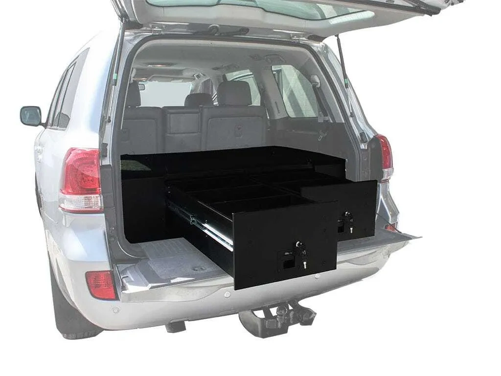 This drawer kit has 2 lockable drawers| 2 keys per lock| 3 tie down rails| 6 tie down rings| deck completion set| face completion set| brackets| all necessary installation hardware| and detailed fitment instructions. Features two equally sized drawers for all storage needs. 113kg / 250 lb per drawer load carrying capacity. High-strength bearing slides allows each drawer to extend nearly 100% from the anchored base. Provide peace of mind and security by locking away important travel items such as computers| smart phones and camera gear. The flat deck incorporates three cargo attachment channels and 6 SSCA047. Customize your own storage configurations. Stack and secure luggage| SBOX031s| SBOX001s| aluminum boxes and other storage containers to the top deck using STRA034 or other straps. The deck above the drawers can also be used to mount Front Runner Cargo/Fridge Slides. The side decks are easily removable creating storage space between the drawers and vehicle for a variety of items such as tools| jumper cables| tow ropes| diving snorkels| masks| fins| kindling| barbeque skewers| etc. To create a removable box option| just insert a SBOX001. Designed to fit inside Front Runner drawers| the SBOX001 can be used to further organize and move gear in and out of a vehicle. To create compartments within the drawers| add the optional steel SSCA050. Helps organize and stop excessive movement of gear and supplies. Sold in pairs| these drawers can accommodate up to 4 dividers per drawer. The deck is covered with a durable| UV resistant nylon pile black carpet detailed to complement the vehicle’s interior contours. The nylon carpet surface creates resiliency for securing cargo while insulating against noise and vibration. Finished with the same durable black powder coating as Front Runner Roof Racks and other Front Runner products. This drawer kit can be easily installed in minutes by attaching the supplied carabiners and turnbuckles to the vehicle’s existing mounting points and the drawer mounting brackets. Removing the drawers is just as easy. All Front Runner Storage Systems are backed by a 2 year warranty.*Please Note: Cub Packs and Drawer Dividers are not included when purchasing this Drawer System and are sold separately.NOTE: This Drawer Kit is not suitable for the Heritage Edition or models without the 3rd row of seats.