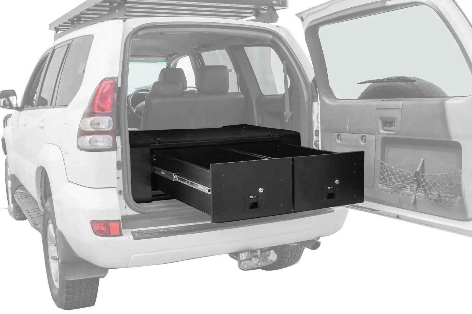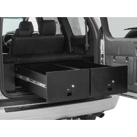 This drawer kit has 2 lockable drawers| 2 keys per lock| 3 tie down rails| 6 tie down rings| deck completion set| face completion set| brackets| all necessary installation hardware| and detailed fitment instructions. 113kg / 250 lb per drawer load carrying capacity. High-strength bearing slides allows each drawer to extend nearly 100% from the anchored base. Allows access for seats to be folded down. Provide peace of mind and security by locking away important travel items such as computers| smart phones and camera gear. The flat deck incorporates three cargo attachment channels and 6 SSCA047. Customize your own storage configurations. Stack and secure luggage| SBOX031| SBOX001| aluminum boxes and other storage containers to the top deck using STRA034 or other straps. The deck above the drawers can also be used to mount Front Runner Cargo/Fridge Slides. The left and right-side Faceplates have 4| pre-cut| knock-outs each for adding electrical panel socket inserts (sold separately). The side decks are easily removable creating storage space between the drawers and vehicle for a variety of items such as tools| jumper cables| tow ropes| diving snorkels| masks| fins| kindling| barbeque skewers| etc. To create compartments within the drawers| add the optional steel SSCA050. Helps organize and stop excessive movement of gear and supplies. Sold in pairs| these drawers can accommodate up to 4 dividers per drawer. The deck is covered with a durable| UV resistant nylon pile black carpet detailed to complement the vehicle’s interior contours. The nylon carpet surface creates resiliency for securing cargo while insulating against noise and vibration. Finished with the same durable black powder coating as Front Runner Roof Racks and other Front Runner products. This drawer kit can be easily installed in minutes by attaching the supplied carabiners and turnbuckles to the vehicle’s existing mounting points and the drawer mounting brackets. Removing the drawers is just as easy. All Front Runner Storage Systems are backed by a 2 year warranty.*Please Note: Drawer Dividers are not included when purchasing this Drawer System and are sold separately.
