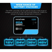 The MPPT controller can be used to charge a wide range of voltages| including 12V| 24V| 36V and 48V batteries. Perfect for setups in canopies| campervans or caravans.