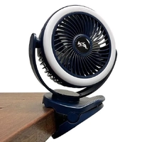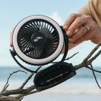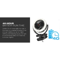 The nifty compact size makes this powerful fan perfect for mounting to hard surfaces| cables| tables or ceiling hooks. 40 hour battery run-time| and built-in adjustable LED light.