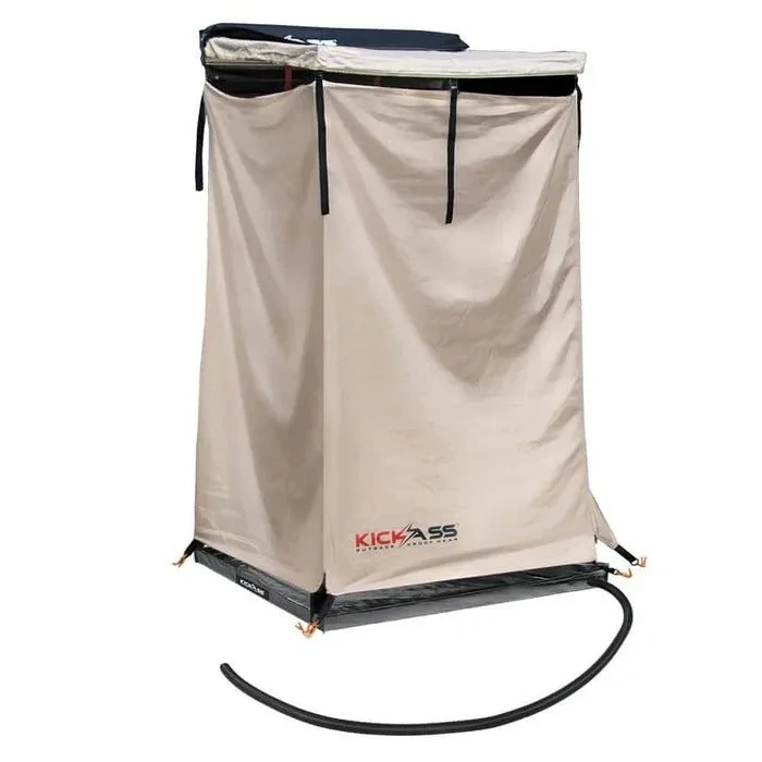 Enjoy privacy and comfort in your campsite with the KickAss Premium Shower Awning| complete with roof and base for full enclosure. Built tough with reinforced self-locking hinges| heavy-duty zips| and integrated storage bags for easy setup and pack-down. Awning Folds Out in 7 Seconds Roof Adds Privacy & Protection Water Resistant Storage Pockets Heavy Duty Fabric - No Silhouettes LED Light Strip Shines Brightly Description KickAss Premium Shower Tent Awning with Roof & Base Success 7 SECOND SETUPSimply unzip| fold out and peg down where necessary. Shower Awning Roof Add an extra level of privacy to your shower awning with the shower awning roof. Shower roof simply slides into the divet on the shower awning. Can be folded up with the shower awning. Water Resistant Storage PocketsProtect your phone and other electronics devices while you shower adding an extra layer of convenience to your shower awning. Perfect for securing your KickAss Led Torch for light at night. Inside & Outside Zippers on Both SidesZippers are located both within and outside of the shower awning| meaning no matter your set up or shower awning position| you can conveniently close and open your shower awning. SAG-FREE DESIGNHere at KickAss we want your set-up to look the best| that's why we haven't overlooked any part of this design! Our sag-free design means your tent remains structural| allowing you to hang a towel over the side and keep your bathroom items inside without any drooping! NO SILHOUETTES! Secure your KickAss Hot Water System Shower Head or Lithium Shower with the convenient Shower Holder. VEHICLE MOUNTEDSave space by easily mounting the KickAss Shower Awning to your vehicle using the provided brackets. The most compact solution to having privacy anywhere in Australia. Adjustable Hanging strapsEasily change the height to suit your needs. Adjustable straps allow you to lower the tent to use for privacy as a bathroom| or move the tent higher for use during a shower orwhile changing. Height ranges between 1.6-2.1m. Mesh bagsPracticality is important| so we’ve added convenient mesh bags to hold your shower & bathroom items neatly inside.