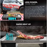 The electric BBQ uses minimal power| but heats up quickly and reaches 240°C in just 2 minutes. Control the temperature with the touch of a button so you can enjoy sizzling snags anytime| anywhere.