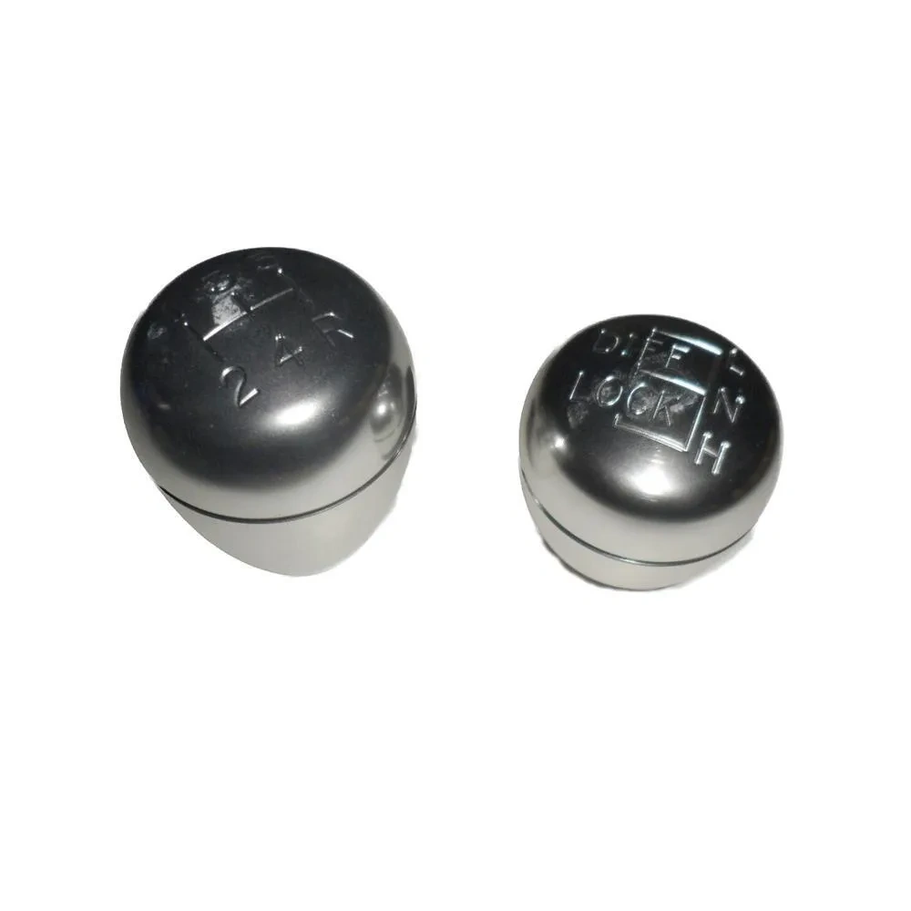 Smart alloy replacement main gear lever and transfer gear lever set. Replace your tired old plastic gear lever knobs with a pair of these stylish new CNC machined alloy ones. A smart design that is anodised for durability and will enhance the interior of any Defender with R380 gearbox.