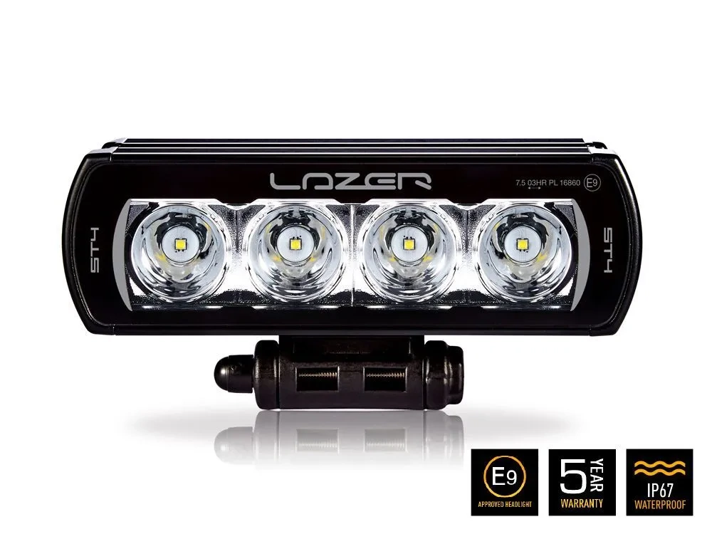 The ST / T Evolution range of products feature highly efficient| premium ‘bin’ 11W LEDs in combination with vacuum-metallised conical optics to deliver a powerful beam pattern with wide spread. This makes the products especially well-suited to rural and off-road applications. Available in sizes ranging from the 124mm (5”) ST2 to the 1164mm (46”) T28| these are LED light bars benefitting from huge versatility| having been adopted across a wide range of different applications and vehicle types| since the products were first launched in 2010. Since then| the range has been re-engineered and re-designed incorporating the latest and best technology alongside a more contemporary| seamless| low profile design making them easier to install| more resistant to dirt| snow and ice accumulations and with styling guaranteed to complement and enhance the appearance of modern vehicles. Superior lighting performance is delivered by the high power 11W LEDs| alongside advanced electronic design| combined with sophisticated thermal management systems and ultra-reflective vacuum-metallised reflectors to harness the maximum amount of light where you need it: on the road or trail ahead. Like all Lazer products| the LEDs are carefully selected at 5000k colour temperature to maximise sharpness and definition of your surroundings. Performance aside| the ST / T Evolution LED light bars are built to last backed by a comprehensive 5 year warranty. Designed| engineered and manufactured in-house| in the UK| there’s no compromise when it comes to build quality| ensuring the lights perform as well as they look and function for years to come. Specs Based on: 1x ST4 Evolution. Voltage Range (DC) -- 10-32V LED Life -- 50|000 hours Weight -- 670 gr HIGH BEAM FUNCTION Total Luminous Flux -- 4136 Lm Total Driver 'FOV' Flux † -- 2490 Lm Colour Temperature -- 5000K Number of High Output LEDs -- 4 Power Consumption -- 47 Watts Current Draw (at 14.4V) -- 3.3 Amps DIMENSIONS Width -- 204 mm Depth -- 68 mm Height -- 64 mm PHOTOMETRIC DATA Horizontal Beam Angle -- 40° 0.25 lx Line -- 555 metres 0.5 lx Line -- 393 metres 1 lx Line -- 278 metres 3 lx Line -- 160 metres † Driver FOV flux is a measure of effective lumens taking consideration of the amount of light in a driver's 'field-of-view' defined as an area +/- 45o left/right| and +/- 10o up/down. For more information – click here. What's Included: x1 ST4 Evolution LED Lamp x1 Centre Mount (1114K) x1 Installation Instructions SKU: 0004-EVO-B