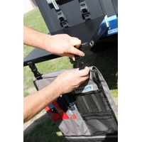 Included is a durable MSA Canvas Cutlery Roll that easily attaches to the outer edge of the Drop Slide™ Clip-On Table keeping cutlery and other cooking utensils within easy reach. A convenient Velcro pocket| suited for a 380mm x 290mm cutting board is located on the side. A cutting board is recommended as cutting directly onto the Clip-On Table is not advisable.