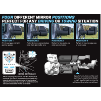 The large single mirror lens creates less confusion and enhanced safety while driving. The four| easily adjustable positions| provide greater vision| with less vibration to any towing situation| while maintaining ADR compliance and safety. When the mirror is rotated into the horizontal position| the mirror’s actuator automatically adapts| allowing for standard adjustments (up| down| side to side) from the vehicle’s standard mirror controller. This caters to drivers of differing height and seated positions. Designed to fold inwards or outwards when bumped in car parks| or when contact is made with trees and other obstacles around the vehicle. Simple to fit. MSA 4X4’s Towing Mirrors mount onto a vehicle door in the same position as the existing mirrors. Most factory mirror functions are retained and come with the choice of black or chrome.The MSA 4X4 patented Towing Mirrors are manufactured extremely tough.Injection moulded and die cast aluminium components deliver a high-quality towing mirror to withstand Australian conditions. A great all-around mirror for towing caravans| camper trailers| trailers| boats and horse floats. Available to suit a growing range of towing vehicles.