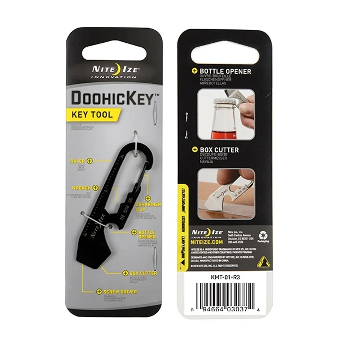 Made of durable stainless steel| the Nite Ize DoohicKey features a half-dozen tools that do everything from tighten bolts and screws to open a bottle of refreshment| all in a simple key tool that fits in the palm of your hand. On one end of the DoohicKey is a sturdy carabiner clip| allowing you to attach keys to it| or attach the DoohicKey itself to any loop or ring. Opposite the clip is an etched ruler for on-the-spot measurements| and the carabiner opening is strategically shaped to function as a wrench. On the other end| the DoohicKey features a bottle opener| a flat head screwdriver| and a box cutter. With a streamlined| clever design that makes it easy to carry| attach| remove| and reattach| it's always as at-hand as it is handy.