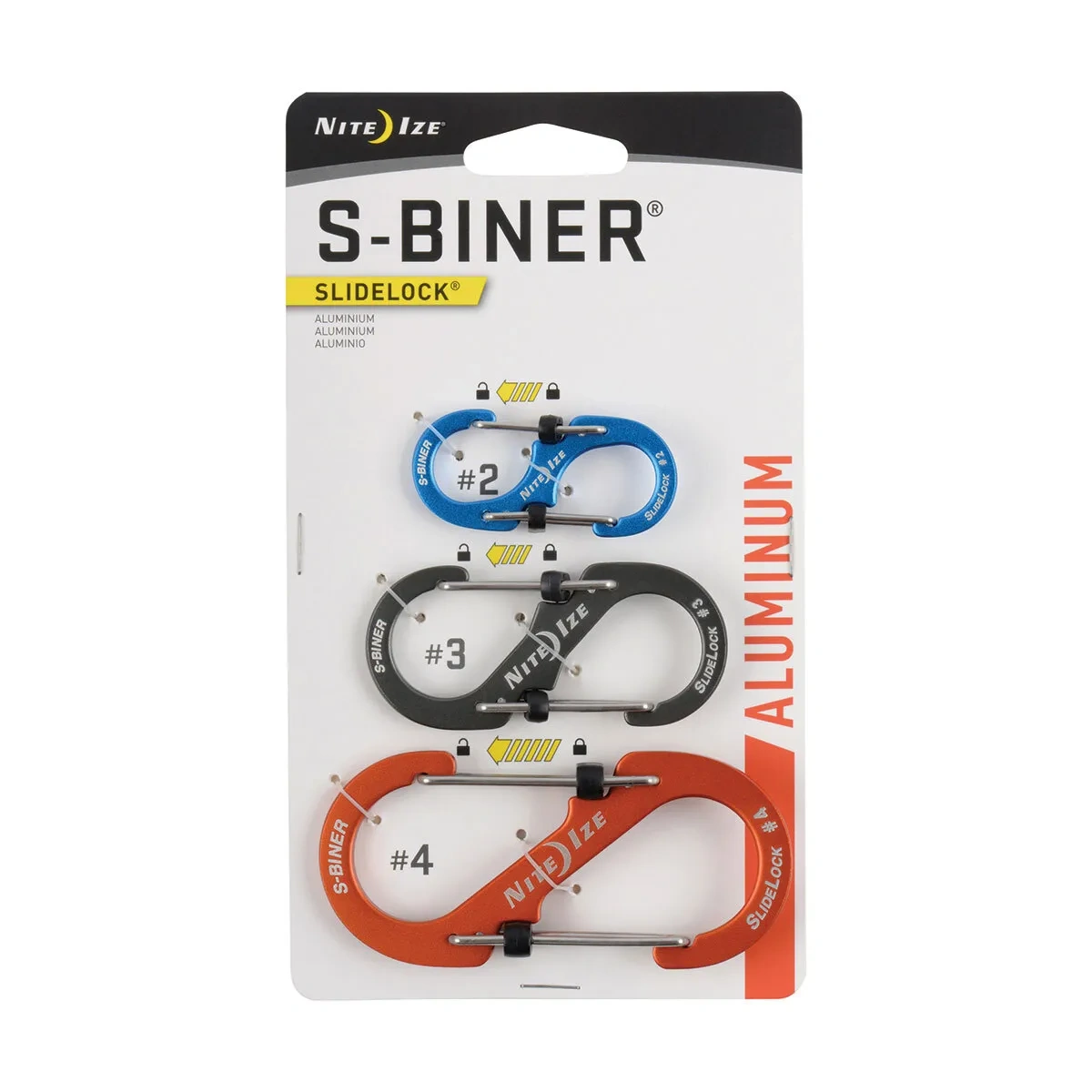 Organize| connect| carry| and keep your valuables extra secure with the colourful| aluminum S-Biner SlideLock Dual Carabiner. Made of high-quality| lightweight aluminium| the S-Biner SlideLock features two simple| innovative plastic sliders that slide into place to keep the stainless steel gates securely closed. Each gate can be locked independently for convenient access. The S-Biner gates will stay firmly locked until you choose to unlock them| allowing for simple and secure linking| attaching| and carrying. Our S-Biner SlideLocks are available in three sizes (#2| #3| and #4) for small-to-large tasks.