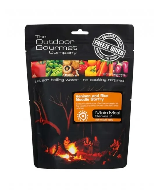 A colourful combination of venison| red pepper and Thai noodles in a flavour infused sauce with a hint of coriander. The Outdoor Gourmet Company has teamed with top Australian chefs using the finest ingredients and modern freeze dried technology to create a selection of convenient and lightweight gourmet meals. Unlike traditional dehydration| freeze drying better locks in nutrition| flavour and texture removing more moisture which improves shelf life. It also reduces weight| and does not require any extended boiling to rehydrate fully. Unlike wet retort packs| freeze dried food is much lighter with a more natural colour and texture. Whatever your need| from extreme expeditions or overnight ambles to emergency rations| you now have the option of choosing from an enticing range of super convenient| lightweight| delicious and nutritionally sustaining meals.