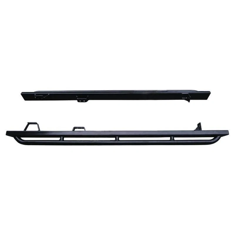 Terrafirma rock sliders to suit a Defender 110 made from black powder coated 80x40 x 3mm thick steel box section with 42.5 x 3mm wall thickness tubular tree bars welded to the sides. All fixings are heavy duty.