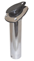 Stainless steel flush mount rod holder with a heavy cast 316-grade head which incorporates a solid shaft collar that is welded all the way around the shaft of the rod holder to give maximum strength. Angled stainless shaft| folding black PVC moulded sealing cap| and full-length rubber liner insert. Solid stainless rod gimbal pin through the shaft. Rubber mounting gasket included.