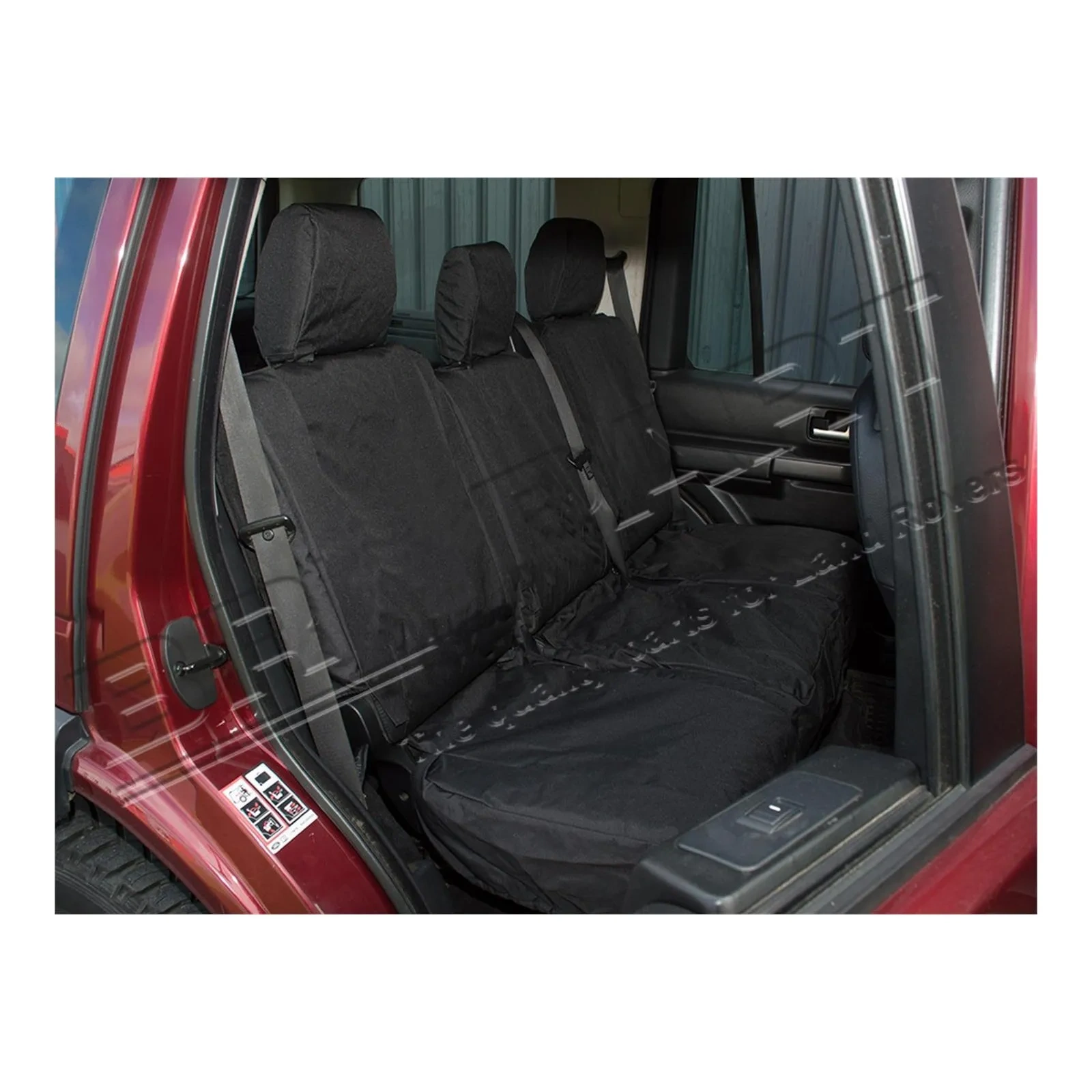 One full set of Rear Black Waterproof Seat Covers with the 35/30/35 split for the Land Rover Discovery 3 models.
