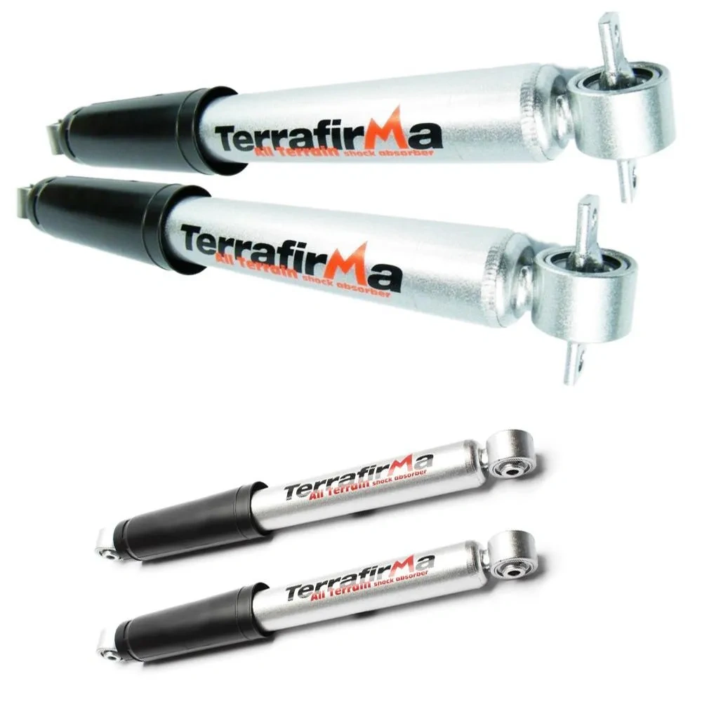 Terrafirma All Terrain shocks are built with the largest possible fully welded mounting pins and rubber bushes for maximum strength and durability. Tough enough to handle the punishment of recreational off-roading yet refined to provide a comfortable| well balanced and controlled ride on road. Finished with a high quality deep silver paint to resist corrosion for long lasting good looks and including the smart Terrafirma All Terrain shock absorber logo.