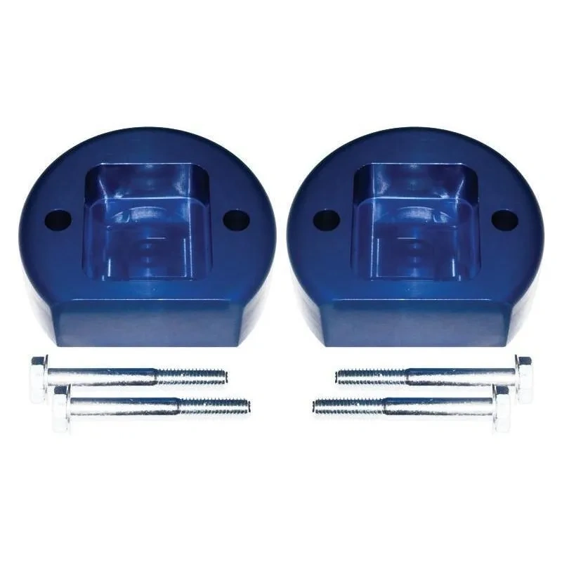 Pair of +40mm Front Spacer Blocks for Land Rover Discovery 2. These are machined from high quality aluminium and anodised deep blue. With this kit you are able to retain the standard springs and shock absorbers. Use in conjunction with DA6342