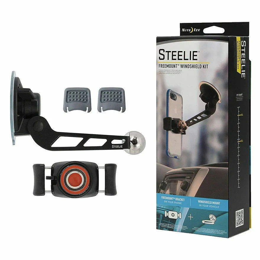Safely communicate and navigate hands-free when you hit the road with the Steelie FreeMount Windshield Kit. Phones of most sizes stay gripped securely in the adjustable FreeMount. The FreeMount arms can be adjusted to hold phones in place with a firm squeeze| and the release button on the back makes it easy to remove your phone with a smooth one-handed motion. As an added bonus| when the FreeMount is on your phone| you will be able to connect it magnetically to other convenient surfaces like your refrigerator| tool box| or other Steelie mounts.The Steelie FreeMount Magnet contains a silicon center| creating a smooth glide and firm grip when connected to the Steelie Ball that allows you to easily adjust or rotate the phone from portrait to landscape as needed. The Windshield Mount features an adjustable aluminum arm and suspended Steelie ball design. The arm can be securely adjusted to the ideal angle. The patented suction cup design features an easy-to-use locking lever that engages the suction cup for ultimate holding power to your windshield. It also acts as a quick release lever when you want to remove it to put it in another vehicle.*The Steelie FreeMount Bracket contains a strong magnet. This magnet will NOT damage your mobile device; however| do not place it near magnetically sensitive objects such as credit cards| pacemakers| or computer hard drives. Nite Ize assumes no liability for damage to such products.