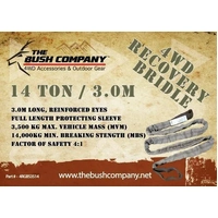 Specifications Width “ 60mm Length “ 3m Safety Factor 4:1 Min breaking strength “ 14|000kg Maximum Gross Vehicle Mass “ 3.5T Reinforced End Loops “ Yes Fully Sleeved webbing “ Yes The Bush Company Recovery Bridle 14T / 3m| also known as an equalizer strap| is 3m in length and has a rated breaking strain of 14|000Kg. The recovery bridle is designed to connect between two recovery points on the front or rear of your vehicle and allows for relative movement on the winch wire| tow rope| or snatch strap to deflect from side to side allowing the recovery vehicle and the vehicle to be recovered independence of movement. The Bush Company Recovery Bridle is specifically made for use as a bridle and has two layers of webbing sewn together with a high wear protection sleeve and reinforced end loops. Like all of the recovery gear by The Bush Company| the recovery bridle is based on a 4:1 safety factor| so with a breaking strain of 14T| the bridle can be safely used to recover a gross vehicle mass of 3.5T.
