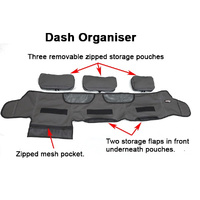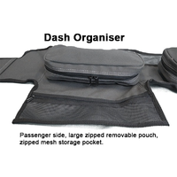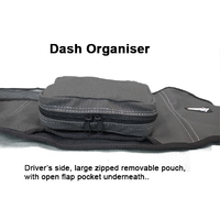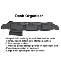 Toyota Landcruiser (J70) Series 2007 ‚ú Dashboard Organiser from The Bush Company is the ultimate in quality and design and has been specifically designed to fit the dashboard for the J70 Series. Made from the highest quality Italian canvas| double-stitched throughout and UV stabilized| the dashboard organizer not only protects your vehicle's dashboard from damage caused by the sun but also provides much needed unique storage options to maximize what would otherwise be unused space. Material ‚ú UV stabilized Italian canvas double stitched Three zippered removable pouches One large zipped mesh pocket Two open storage pockets beneath pouches Two small storage pockets at each end Shaped to accommodate all air vents. The Toyota Landcruiser (J70) Series 2007 -Dashboard Organiser has three removable zippered storage pouches securely attached to the organizer with large velcro strips. On the passenger side| there is a large zipped mesh pocket| while in the center and on the driver's side there are open flap pockets beneath the pouches. At each end| there is a small flap pocket for storing smaller items. On the rear edge of the organizer| there are two large mesh sections that allow airflow from the windscreen vents| The dash organizer has also been molded around the main air vents on the dash.