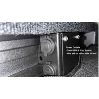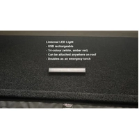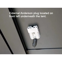 The electrical package provides a 12V Cig socket outlet and twin USB sockets mounted on both sides of the tent as well as a moveable tri-colour rechargeable LED light. The connection to your vehicles power is via 50AMP Andersen plug mounted beneath the tent on the left side.
