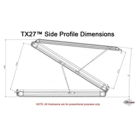 There are high profile automotive rubber weather seals around both the lower and upper lids of the tent| preventing dust and water ingress when closed. The TX27™ itself weighs 123Kg / 271lbs and is ideally suited to large vehicles| camper trailers or toy haulers.