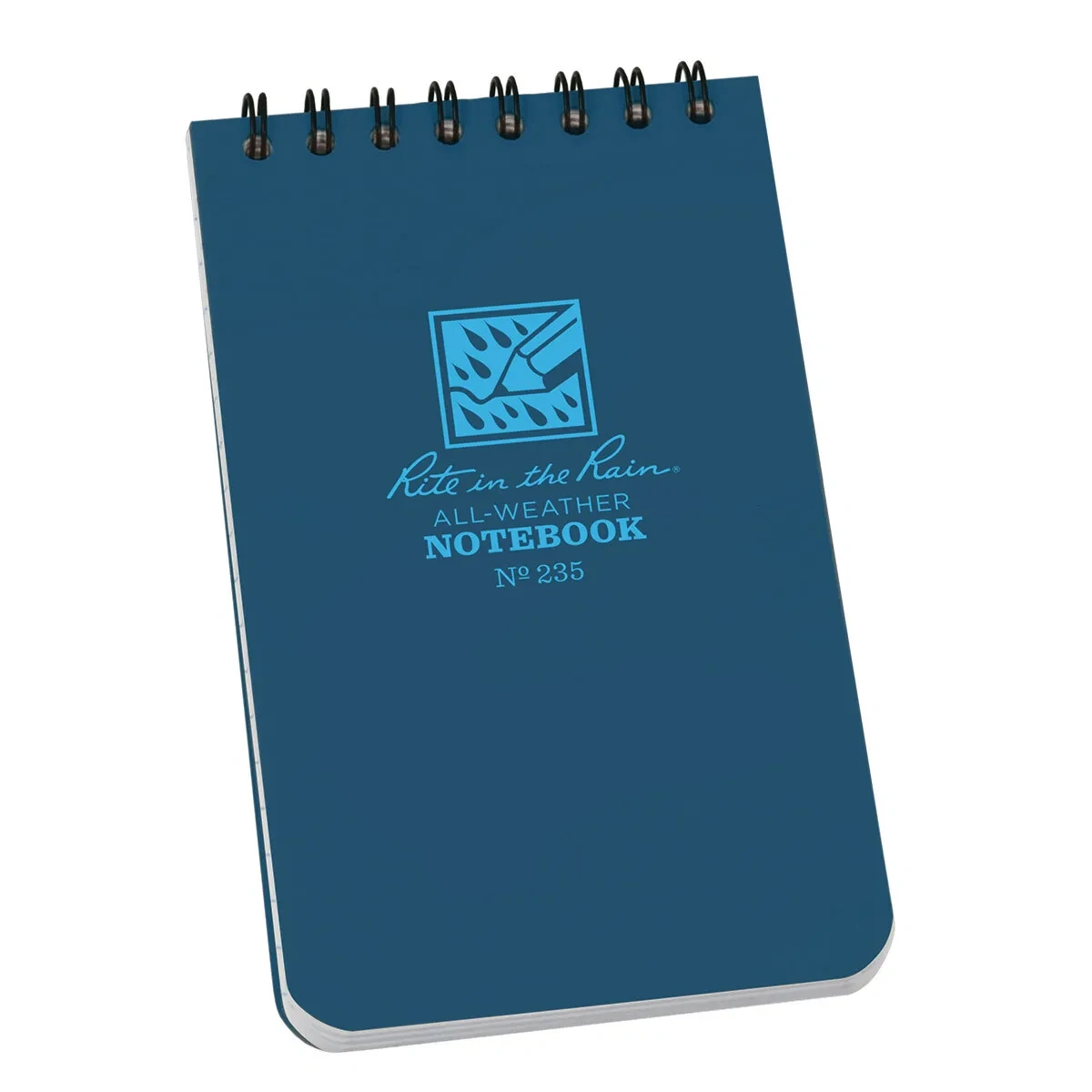 TOP SPIRAL NOTEBOOK: The Blue 3" x 5" top spiral notebook is small enough to fit comfortably in your pocket and tough enough to survive any of Mother Nature's onslaughts. This scrappy pocket notepad will survive rain| sweat| mud| snow| oil| and grease. Impact-resistant Wire-O binding won't lose its shape when tossed around in packs or put in a back pocket. The Polydura cover defends your field notes from scratches and stains. Each notepad is printed with a standard and metric ruler on the back cover. Rite in the Rain All-Weather Writing Products have been made in Tacoma Washington| USA since 1916. Recycle Rite in the Rain Paper with standard papers. Recycle the entire notebook using most curbside programs (paper| plastic| & metal). Simply separate the Wire-O binding from the cover prior to recycling for easier processing.