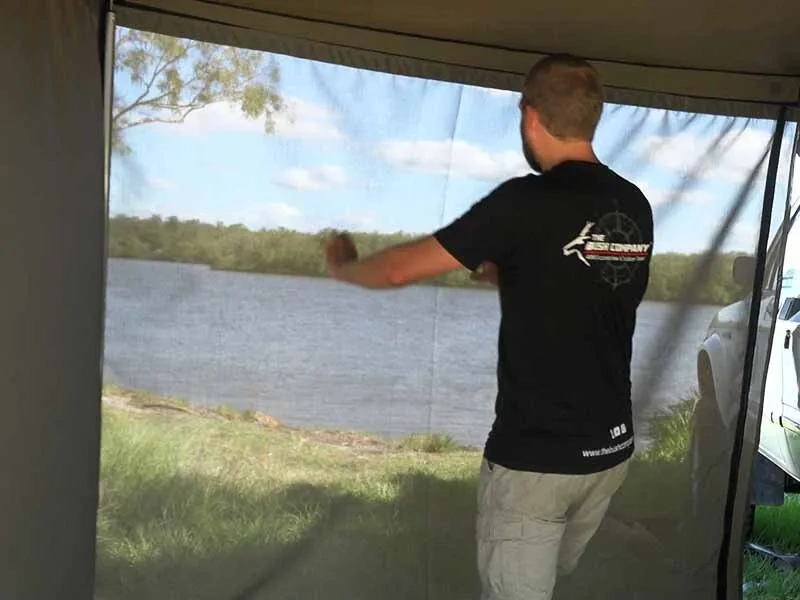 The Bush Company Universal Single Mesh Wall Kit If you are looking to provide some privacy| a wind break or protection from the elements for any of The Bush Company'ss awnings| the Universal Single Mesh Wall Kit is for you. The walls are a universal design with a total width of 2.3m/7's7¬≥ and a maximum height of 2.4m/7's10øΩ. Constructed from a premium one-way vision mesh which makes it hard to see in from the outside whilst providing good visibility from the inside looking out and allowing reasonable air flow. The walls will also provide reasonable protection from light rain preventing much of the moisture from penetrating the wall. Around the base of the wall is a heavy duty 600gsm PVC splash skirt with built in adjustable eyelets for securing the wall with the pegs provided. The kit comes with two aluminium telescopic poles that attach to the awning arms to provide additional support when the wall is in place. Each wall has a zip running down either side enable two or more walls to be joined together. There are zip on section for each side that prevent the zip from scratching your vehicle if you chose to place the wall against you car. Check our the product review video to see how the Universal Single Mesh Wall Kit looks on The Bush Company'ss range of awnings.