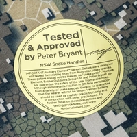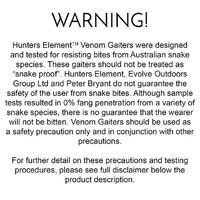 Hunters Element Venom Gaiters were designed and tested for resisting bites from Australian snake species. These gaiters should not be treated as snake proof. Hunters Element| Evolve Outdoors Group Ltd and Peter Bryant do not guarantee the safety of the user from snake bites. Although sample tests resulted in 0% fang penetration from a variety of snake species| there is no guarantee that the wearer will not be bitten. Venom Gaiters should be used as a safety precaution only and in conjunction with other precautions.